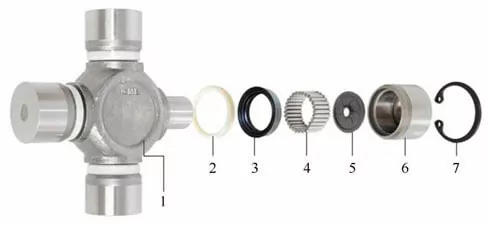 Конструктивно крестовина представляет собой сборочную единицу, которая состоит из самой крестовины с четырьмя шипами, уплотнений и 4-ех игольчатых подшипников. Внешней обоймой подшипника является стакан, а внутренней – шип крестовины. Чтобы предотвратить попадание влаги и загрязнений на игольчатый подшипник, используются пыльники и манжетные уплотнения. Упор шипов крестовины в дно стакана происходит через специальную шайбу, называемую упорным подшипником.