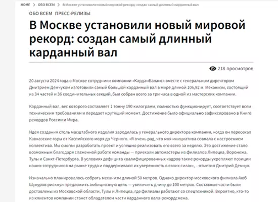 В Москве установили новый мировой рекорд: создан самый длинный карданный вал